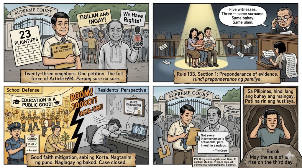 Every Filipino who has ever lived next to an unplanned karaoke bar, a 24-hour construction site, or—apparently—a faith-based school with a marching band knows this frustration in their bones. The Supreme Court just gave it a 17-page citation.