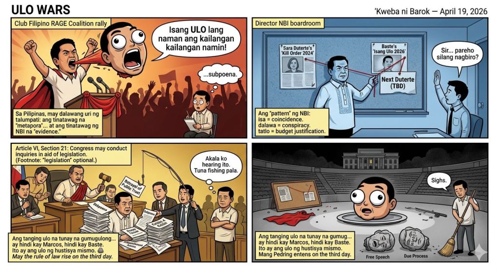 THE foul perfume of Philippine political theater wafts through the air again. On one side of the ring: the Club Filipino stage where Davao Mayor Sebastian “Baste” Duterte, in full anti-corruption froth, declared to the RAGE Coalition faithful that “Tama na yan… Isang ulo lang naman ang kailangan namin, ang ulo ni Bongbong Marcos.” On the other: the National Bureau of Investigation (NBI) boardroom, where Director Melvin Matibag solemnly intones that the Bureau is “reviewing” the remark because, you know, mandate and presidential security and all that jazz—while conveniently spotting a “pattern” with Vice President Sara Duterte’s earlier “kill order” flourish. And hovering above it all, the House Committee on Justice’s subpoena duces tecum, dated March 31, 2026, ordering Matibag to appear April 14 and cough up every scrap of the NBI probe into Sara’s alleged threats.