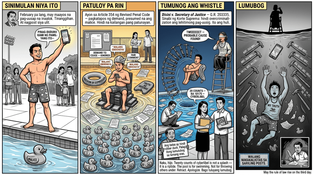 - And to Rob Sy, directly: Naku, kuya. Twenty counts of cyberlibel is not a splash—it is a riptide. Each count carries the potential for imprisonment. Your pool of posts has now become your legal quagmire. Time to stop treading water and start swimming toward an apology before the lifeguards (read: the fiscal and the judge) blow the final whistle.