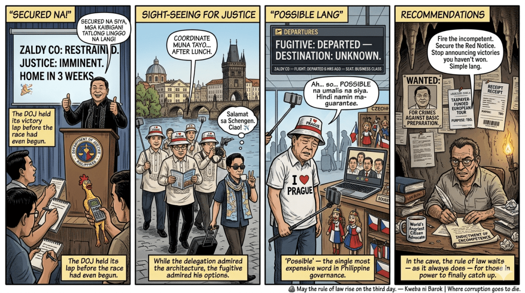 MGA ka-kweba, ladies and gentlemen of the peanut gallery we call the Philippine public, grab your popcorn and your copy of the 1987 Constitution. The Department of Justice just delivered the legal equivalent of a face-plant on live television. Justice Secretary Fredderick Vida, fresh from a Prague junket that smelled more like a taxpayer-funded European tour than a serious extradition mission, has now admitted the unthinkable: fugitive former lawmaker Zaldy Co—the star of the flood-control scandal—may have already waltzed out of Czech jurisdiction while the DOJ delegation was still figuring out how to schedule a meeting with their counterparts.