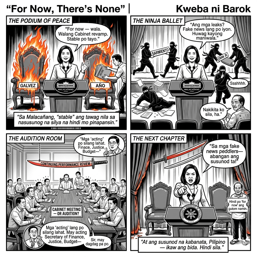 The Palace will, of course, defend this as responsible governance. Rumors paralyze agencies. Officials become lame ducks. Investors flee uncertainty. Better to project stability, they argue, than feed the beast of speculation. Fair enough on paper. But the defense collapses the moment one consults recent history. This is not the first denial. Similar assurances were issued in January after leaks of a nine-agency purge. They were issued again after earlier 2025 reshuffles. Each time the smoke was dismissed as disinformation—until the resignations arrived anyway. Credibility is not a renewable resource; it is spent. And when senators like Rodante Marcoleta publicly flag the epidemic of “acting” secretaries running Finance, Budget, Justice and more, the Palace’s stability sermon rings hollow. A government of caretakers cannot plan beyond the next rumor cycle. It is governance by Sword of Damocles—every official’s neck permanently under the blade of “continuing performance review.”