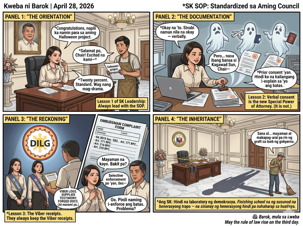 Newsflash, Counselor Yabut: Public documents are not your barangay Facebook group chat. Under Philippine law, forging signatures on official resolutions, purchase requests, and certifications is straight-up Falsification of Public Documents (Act No. 3815 (Revised Penal Code), Art. 171). Verbal “consent” doesn’t cut it. You need a Special Power of Attorney—not a casual “go ahead, girl.” The law demands formality precisely because public office is a public trust (Article XI, Section 1 of the 1987 Constitution of the Republic of the Philippines). Your “everyone does it” defense is the same intellectually bankrupt drivel we hear from every trapo caught with his hand in the till. It doesn’t work for congressmen. It certainly doesn’t work for SK chairpersons who are supposed to be the antidote to, not the mirror of, adult venality.