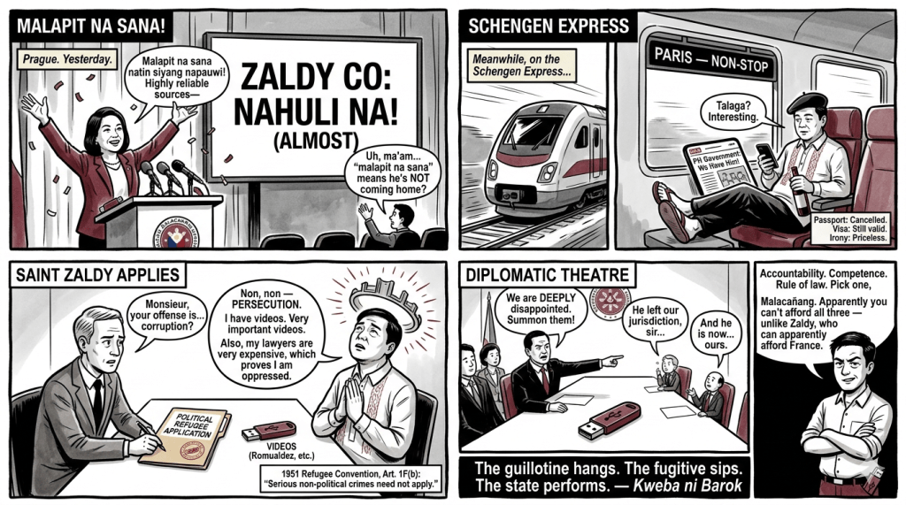 MGA ka-kweba, ladies and gentlemen of the peanut gallery, grab your san mig and your 1987 Constitution of the Republic of the Philippines (1987 Constitution) – because today, your favorite caveman, Barok, is in full surgical mode. We are not here for polite press releases. We are here to carve up the corpse of this transcontinental clown show like a Sandiganbayan ponencia on steroids. Zaldy “Walking Budget Insert” Co, the man who allegedly turned flood-control projects into personal ATMs, has traded Czech custody for French vin rouge and a shiny new asylum petition. Palace Press Officer Claire Castro just dropped the bombshell, and Malacañang is doing the diplomatic equivalent of a three-stooges routine: “We were this close!”
